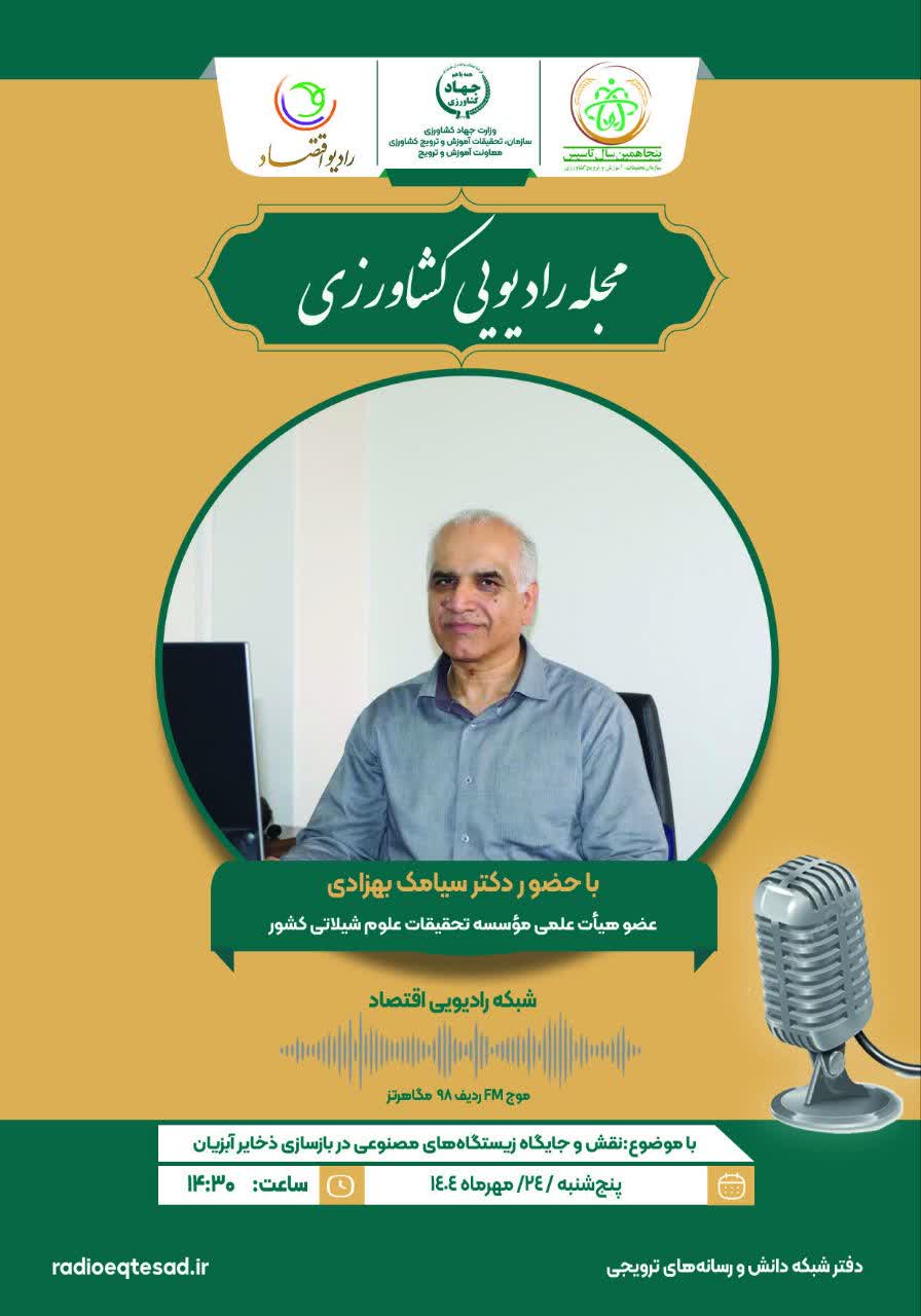مصاحبه رادیویی با موضوع : نقش و جایگاه زیستگاه های مصنوعی در بازسازی ذخایر آبزیان مصاحبه رادیویی با موضوع : نقش و جایگاه زیستگاه های مصنوعی در بازسازی ذخایر آبزیان 1404/7/23 (60) (0) مصاحبه رادیویی با موضوع : نقش و جایگاه زیستگاه های مصنوعی در بازسازی ذخایر آبزیان مصاحبه رادیویی با موضوع : نقش و جایگاه زیستگاه های مصنوعی در بازسازی ذخایر آبزیاندکتر سیامک بهزادی(عضو هیات علمی موسسه تحقیقات علوم شیلاتی کشور)پنج شنبه 24 مهرماه 1404ساعت:14:30