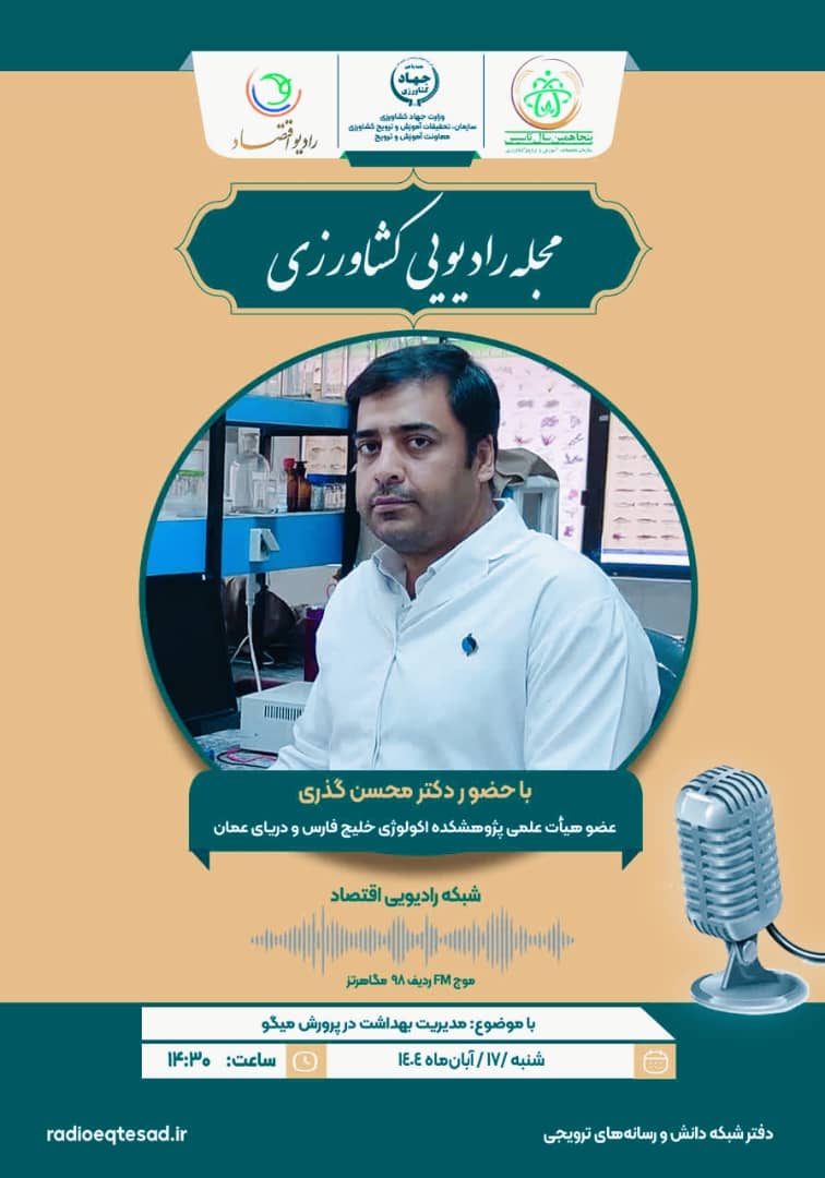 مجله رادیویی کشاورزی مجله رادیویی کشاورزی 1404/8/16 (11) (0) مجله رادیویی کشاورزی مجله رادیویی کشاورزی: با حضور دکتر محسن گذری عضو هیات علمی پژوهشکده اکولوژی خلیج فارس و دریای عمان موضوع: مدیریت بهداشت در پرورش میگو شنبه 17 آبان ماه 1404 ساعت 14:30