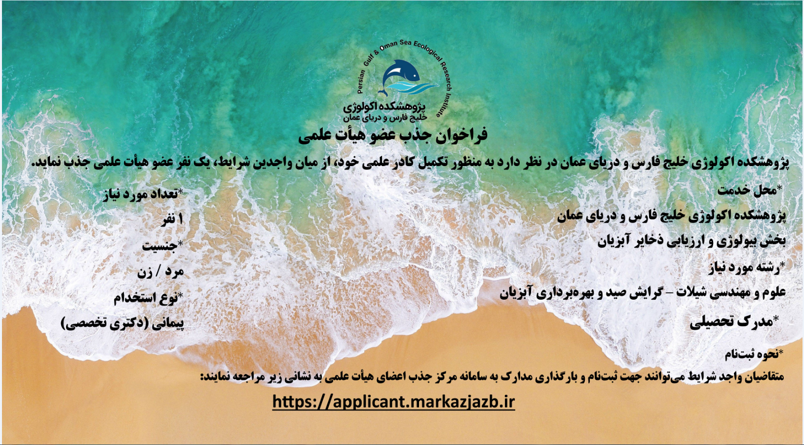 فراخوان جذب عضو هیأت علمی فراخوان جذب عضو هیأت علمی 1404/11/16 (15) (0) فراخوان جذب عضو هیأت علمی 📢 فراخوان جذب عضو هیأت علمی پژوهشکده اکولوژی خلیج فارس و دریای عمان در نظر دارد به منظور تکمیل کادر علمی خود، از میان واجدین شرایط، یک نفر عضو هیأت علمی جذب نماید. 🔹 محل خدمت پژوهشکده اکولوژی خلیج فارس و دریای عمان بخش بیولوژی و ارزیابی ذخایر آبزیان 🔹 رشته مورد نیاز علوم و مهندسی شیلات – گرایش صید و بهرهبرداری آبزیان 🔹 مدرک تحصیلی دارا بودن مدرک دکتری تخصصی (Ph.D) مرتبط 🔹 تعداد مورد نیاز ۱ نفر 🔹 جنسیت مرد / زن 🔹 نوع استخدام پیمانی (دکتری تخصصی) 🌐 نحوه ثبتنام متقاضیان واجد شرایط میتوانند جهت ثبتنام و بارگذاری مدارک به سامانه مرکز جذب اعضای هیأت علمی به نشانی زیر مراجعه نمایند: 🔗 https://applicant.markazjazb.ir از کلیه افراد واجد شرایط دعوت میشود در مهلت مقرر نسبت به ثبتنام اقدام نمایند.